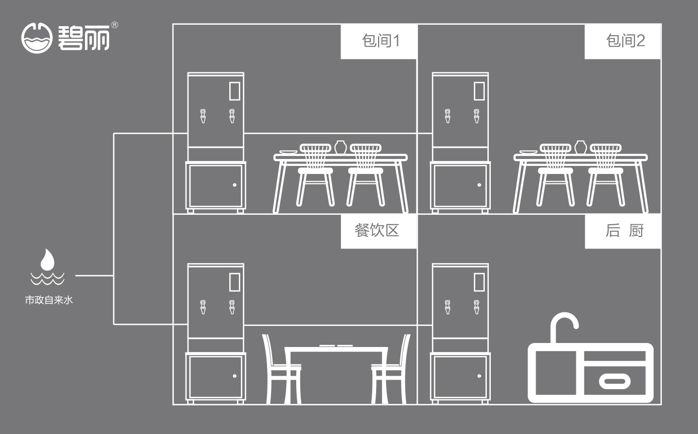售后維護、更換濾芯方便,解決因場地限制無法滿足同時供應多個飲水點的難題;