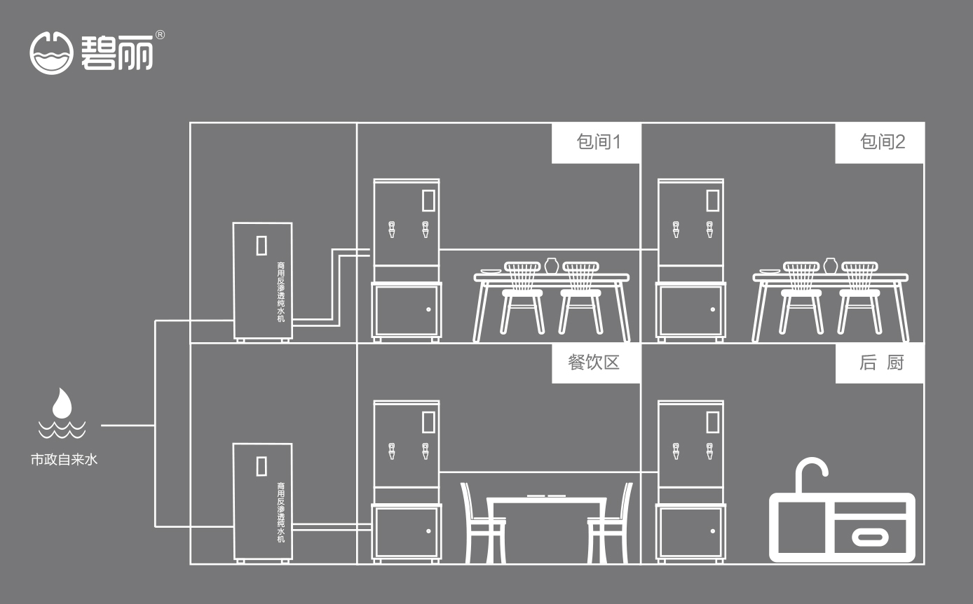 碧麗商用反滲透純水機將自來水集中處理后,把優(yōu)質(zhì)的純凈水通過專用的供水管道輸送到各飲水點;