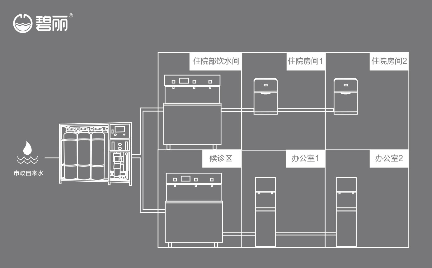 碧麗商用反滲透純水機將自來水集中處理后,把優(yōu)質的純凈水通過專用的供水管道輸送到各飲水點;
