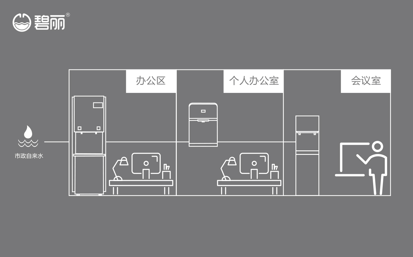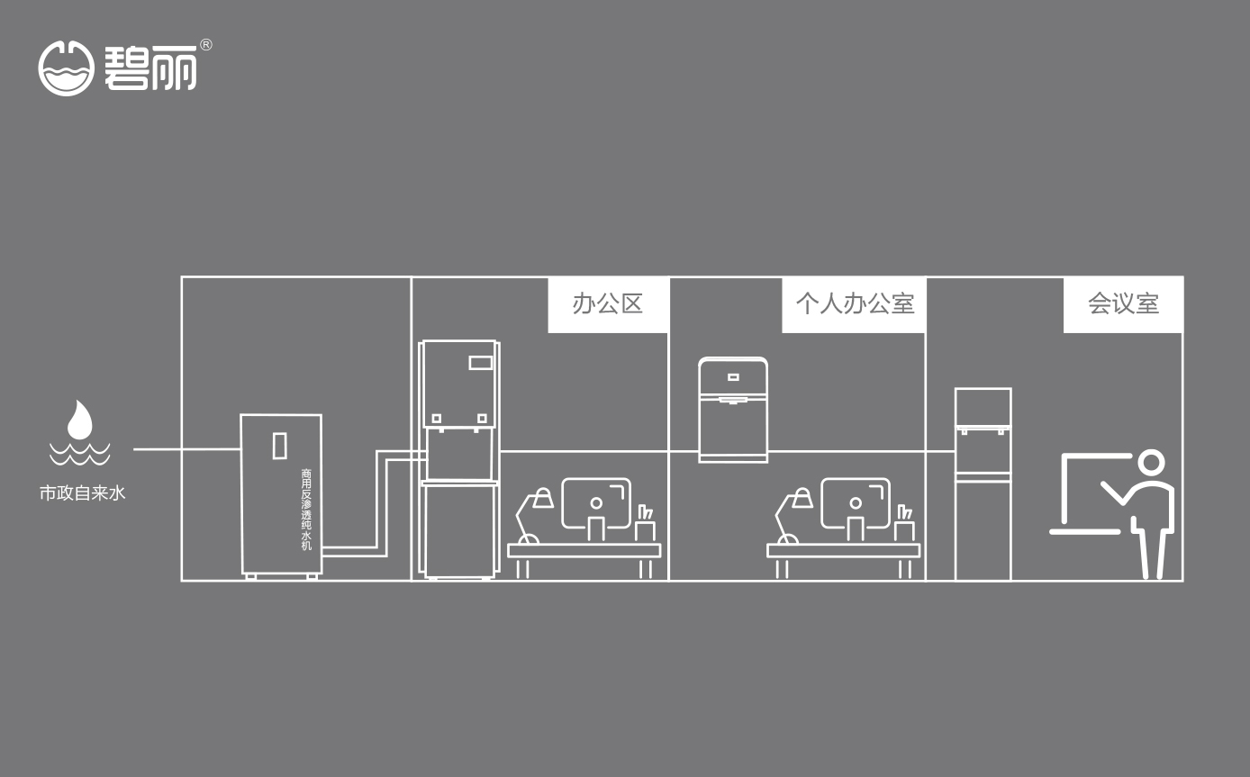 碧麗租賃商用反滲透純水機將自來水集中處理后,把優(yōu)質(zhì)的純凈水通過專用的供水管道輸送到各飲水點;